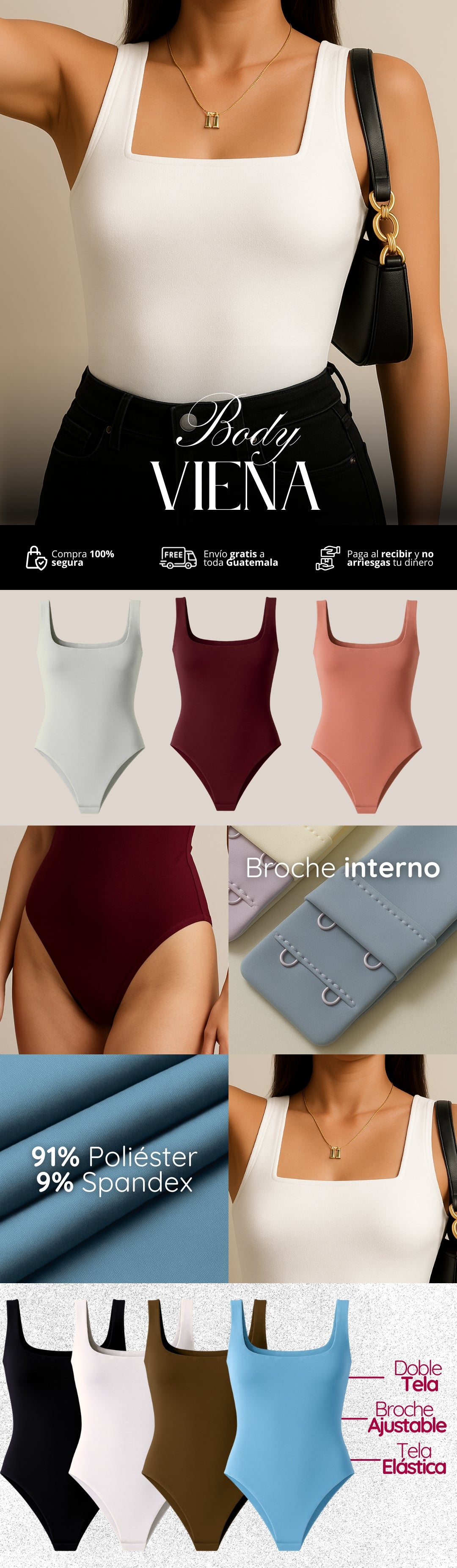Nuestro body Viena está elaborado en tela suplex de alta calidad. Vas a poder sentir que horma tu figura, realza tu cuerpo y estiliza cualquier outfit que quieras llevar.